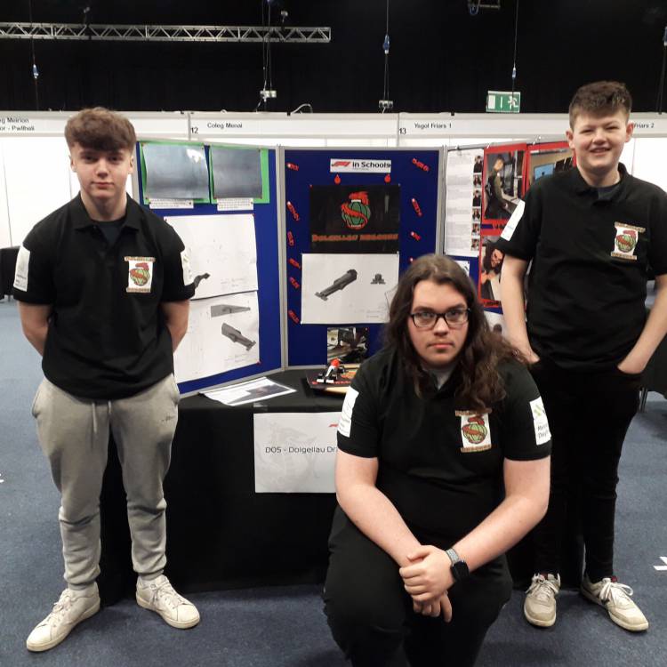 The ‘Dreigiau Dolgellau’ team represented Coleg Meirion-Dwyfor’s site in Dolgellau, which included Engineering students, Gethin, Ned and Sïon - who won the award for the fastest car.